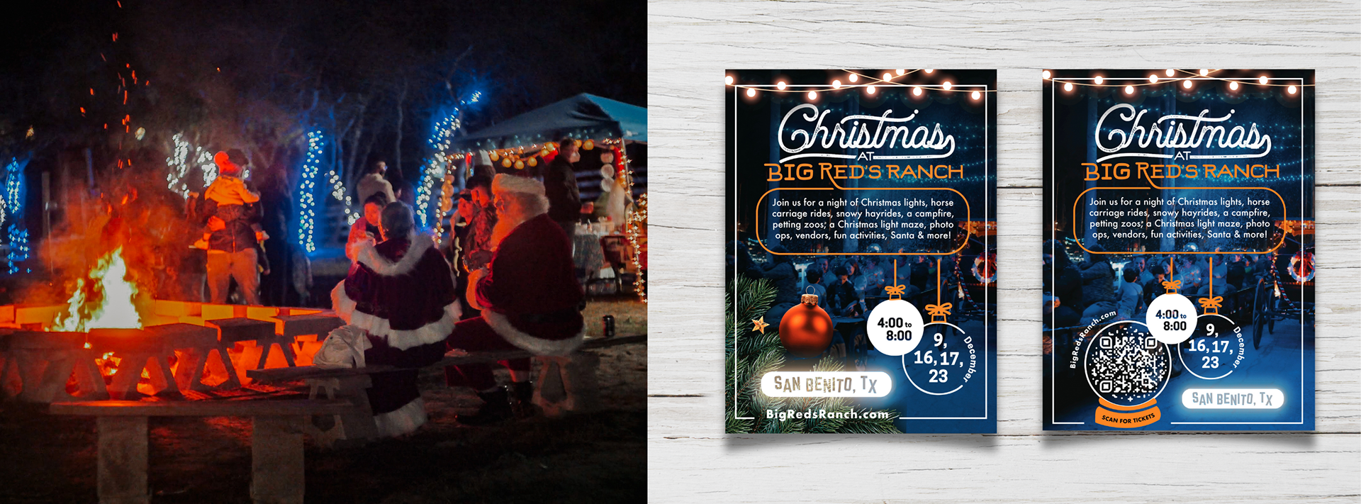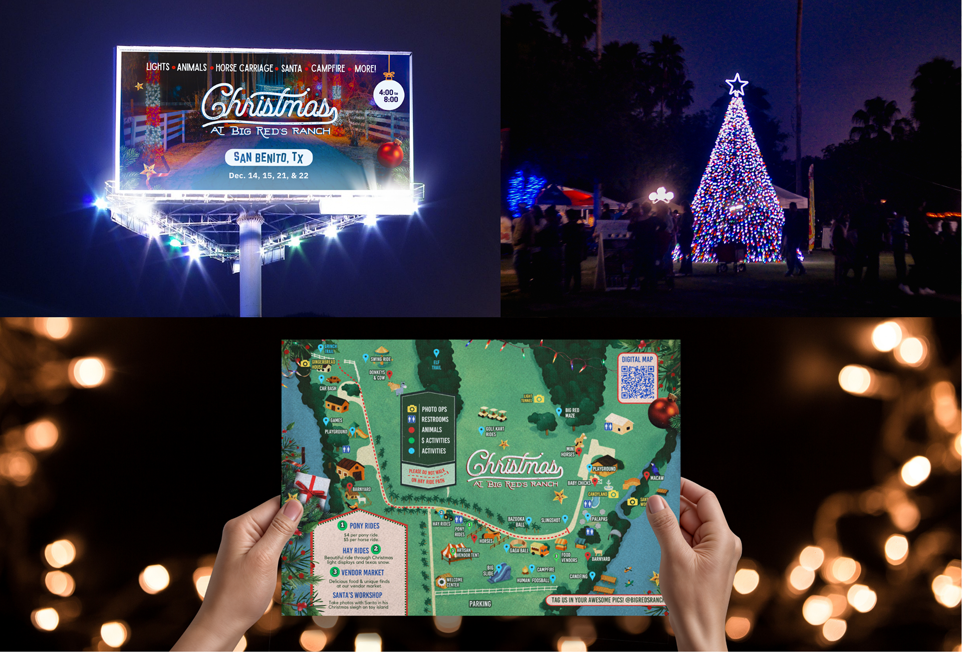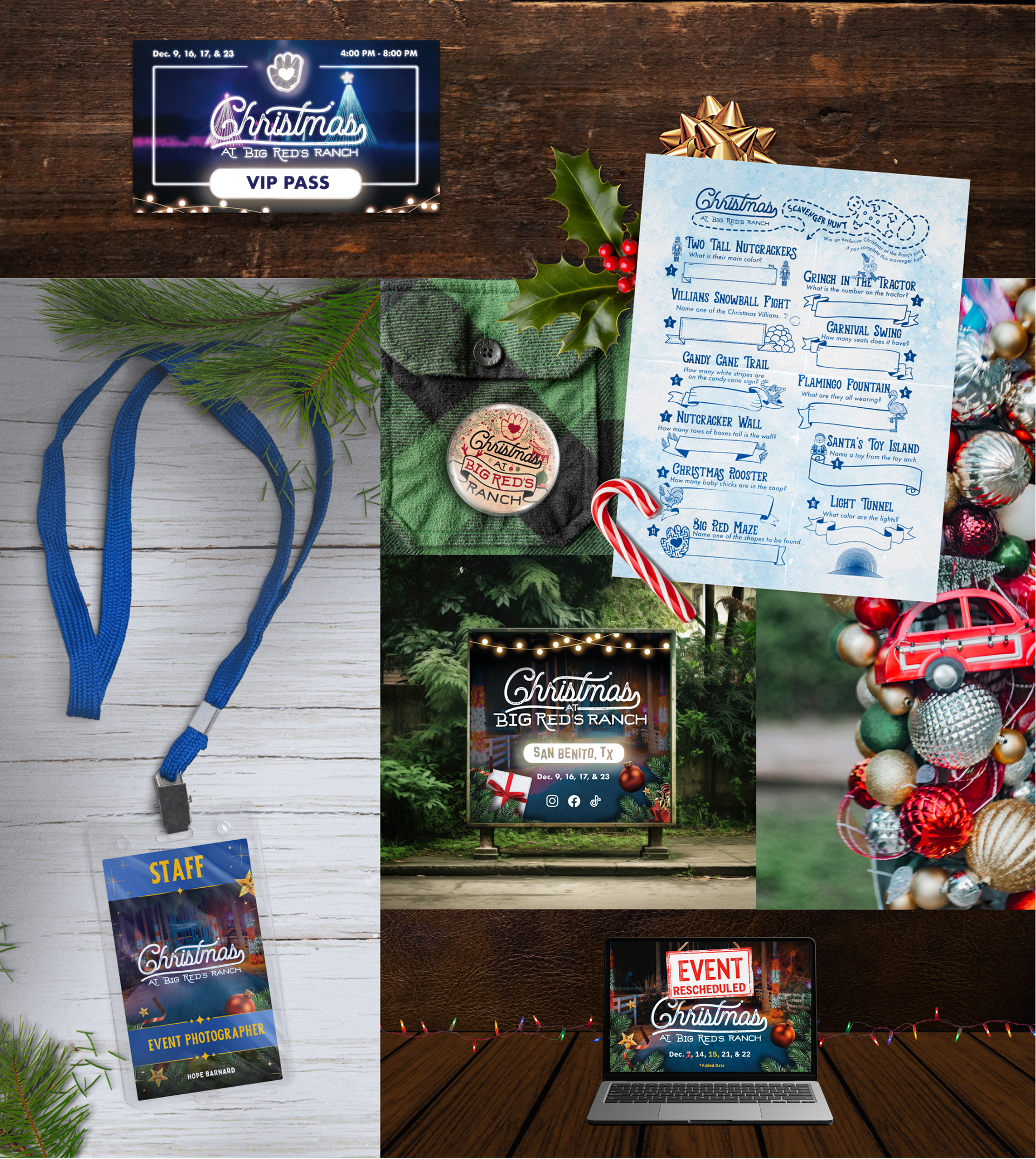Christmas at Big Red’s Ranch is a festive, family-centered event that transforms the ranch into a glowing holiday destination. I led the event’s branding, map design, marketing, environmental design, and print materials while also serving as the event photographer and videographer. My goal was to design an identity that captured the warmth and nostalgia of Christmas through twinkling lights, festive visuals, and creative storytelling.